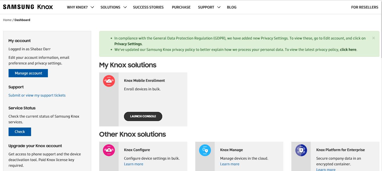 Before you can configure the integration between Knox Enroll and Intune you need to first signup to Samsung Knox which is a relatively straight forward process. The only slight frustrating part of this is that you have to apply for the Enroll service which can take 2-3 days to go through. Once you are past that you are into the dashboard.