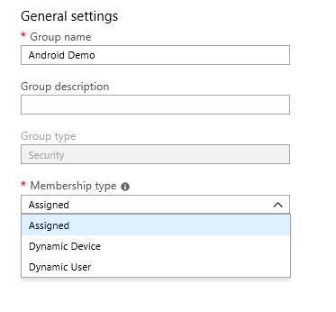 The feature to understand when creating a security group in Intune is the Membership type, and as you can see from the image above there are three: