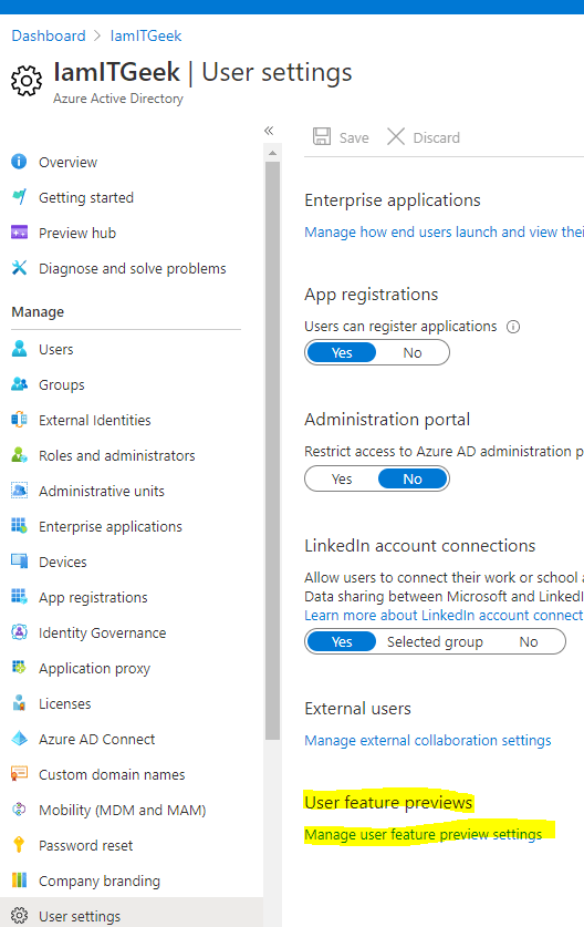 The first step was to create a security group in the Azure AD tenant and add the relevant users for whom I wanted the Passwordless sign-in to apply to. Once this was completed, I needed to confirm that I enabled the ‘combined registration experience’. I did this be going to the Azure Ad tenant > User Settings > User Feature Preview and clicking on ‘Manage user feature preview settings’ (as seen below).