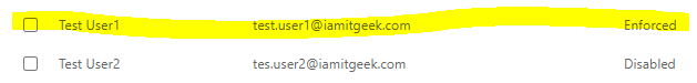 The first item I checked was to ensure the users in question had MFA enabled and set to ‘Enforced’ or ‘Enabled’ (as seen below).