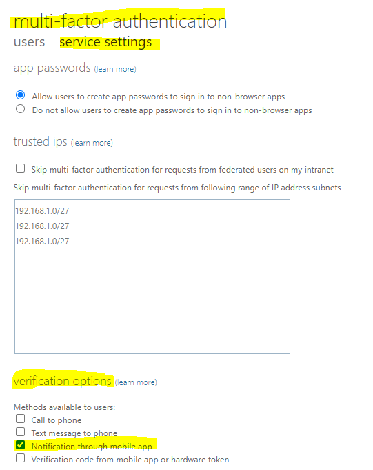 In my case it was ‘Test.User1@iamitgeek.com’ (I know original right?) who was part of the security group that I wanted the Passwordless configuration to apply to. I then wanted to ensure my MFA configuration had the correct verification option for ‘Notification through mobile app’ enabled within the ‘Service Settings’ (as shown below)